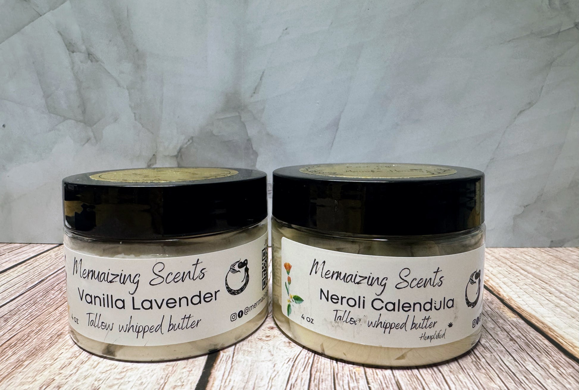 Calendula Neroli ~ Ingredients: distilled water, grass feed, free range local beef tallow, Shea butter, hemp seed oil, cocoa butter, calendula infused olive oil, ritamulse SCG, polawax, cetyl alcohol, rose hip oil, dl panthenol, allantoin, elderberry extract, caprylic triglyceride, neroli essential oils, liquid germall plus, and mica.